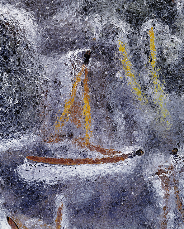Fotografi av tallbarr infrusna i is. Blått, vitt och brunt.